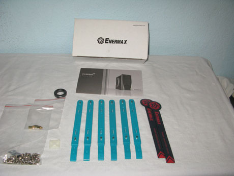 Aparte, trae una pequeña caja en la que están todos los extras, y accesorios necesarios para no te falte de nada en tu proceso de instalación. Entre ellos se encuentra el manual de instalación, bridas de tela con el diseño particular de Enermax, las guías de sujeción para las unidades ópticas y discos duros, y el montón de tornillos que siempre sobran.