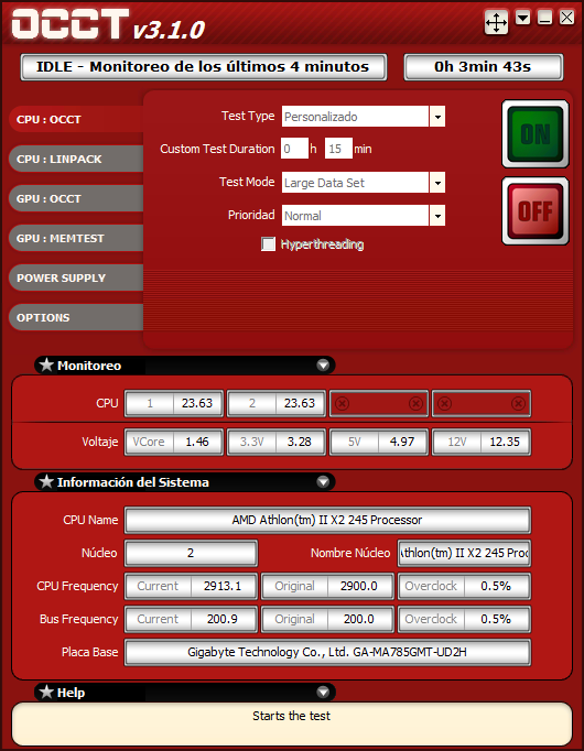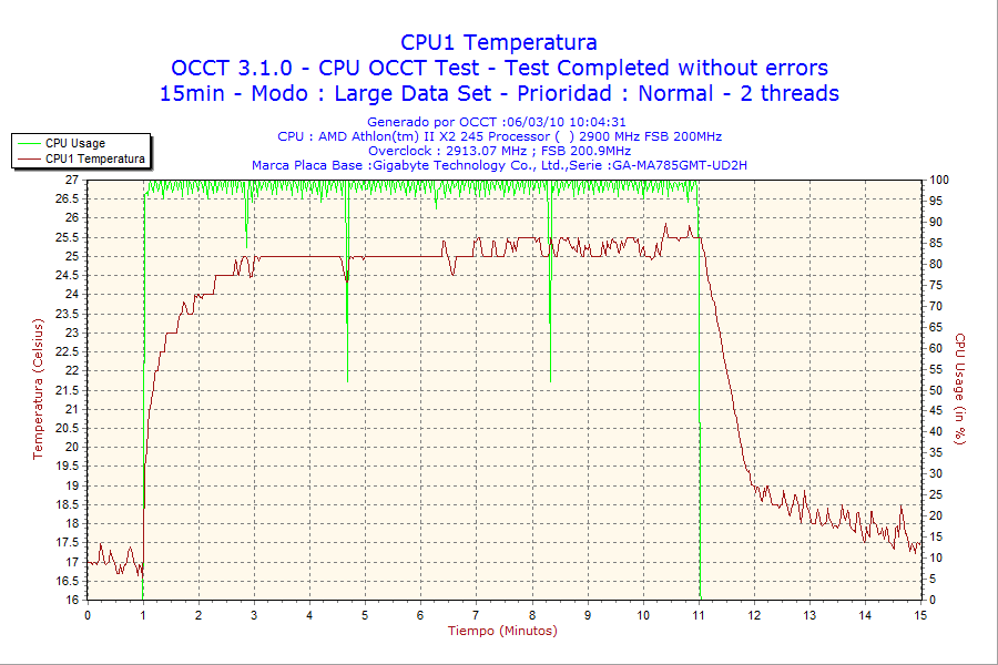 La temperatura ambiente no ha superado los 20ºC. Vamos a ver a qué temperatura aumentan los núcleos con el OCCT a plena carga.