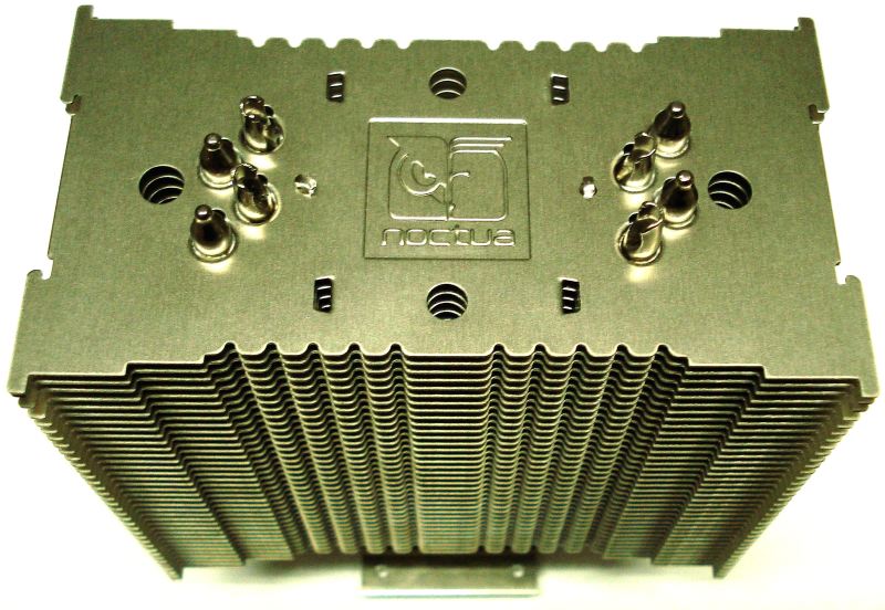Lo que más destaca de esta vista es su silueta por los bordes de los laterales de las aletas, el número de heatpipes, sus perforaciones y el logo estampado de NOCTUA en la aleta superior.