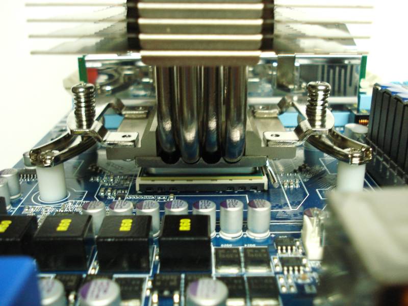 Solo nos queda atornillar los dos tornillos grandes con muelles para fijar y estancar el disipador por su base. Ahora explicaremos por qué el diseño de este kit está correctamente implementado. Si os fijáis, los dos brazos de cada montante presionan hacia abajo por ambos laterales de la base, y su atornillado con ésta está realizado por la cara inferior, así estos tornillos de fijación no tiran, sino que solo fijan, haciendo más robusto el montaje, dejando que presione el metal. Dicho de otro modo, si esos 4 tornillos se desprendieran, cosa casi imposible, el sistema no sufriría cambios, seguiría aún presionando. Los únicos tornillos que sufren son los 4 que tiran del Socket, estos ya son más largos y de mayores dimensiones, para reforzar estas zonas. No obstante el disipador no es tan grande ni pesa tanto como para preocuparnos demasiado. Pero éste es un kit que puede servir para varias series de disipadores, y es una ventaja añadida al diseño.