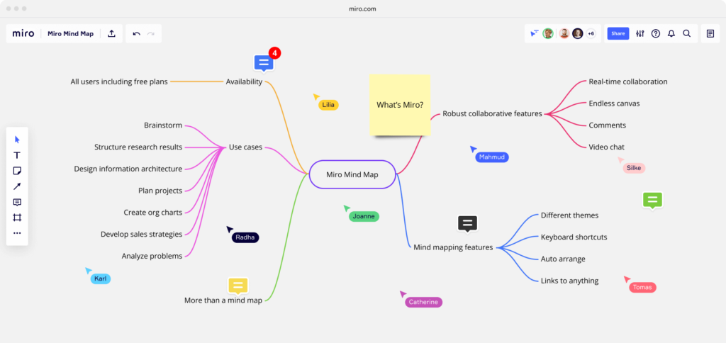 Se trata de Miro, una herramienta que ha sido desarrollada para que creemos fácilmente mapas mentales con ideas, pensamientos o conceptos, relacionándonos entre sí de forma personalizable, para que nada se nos escape.