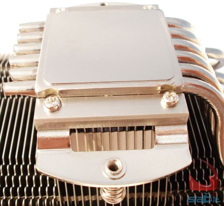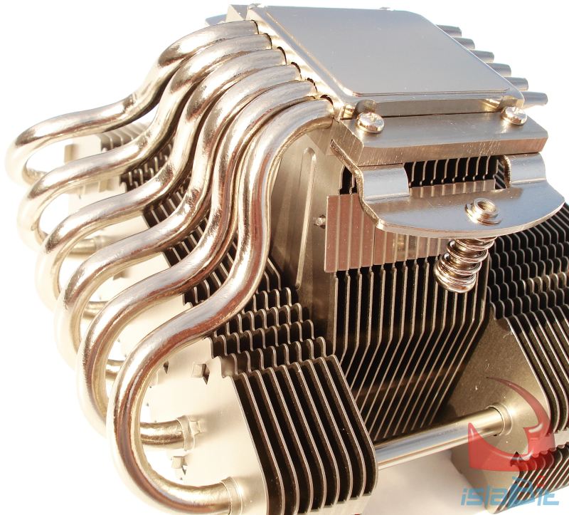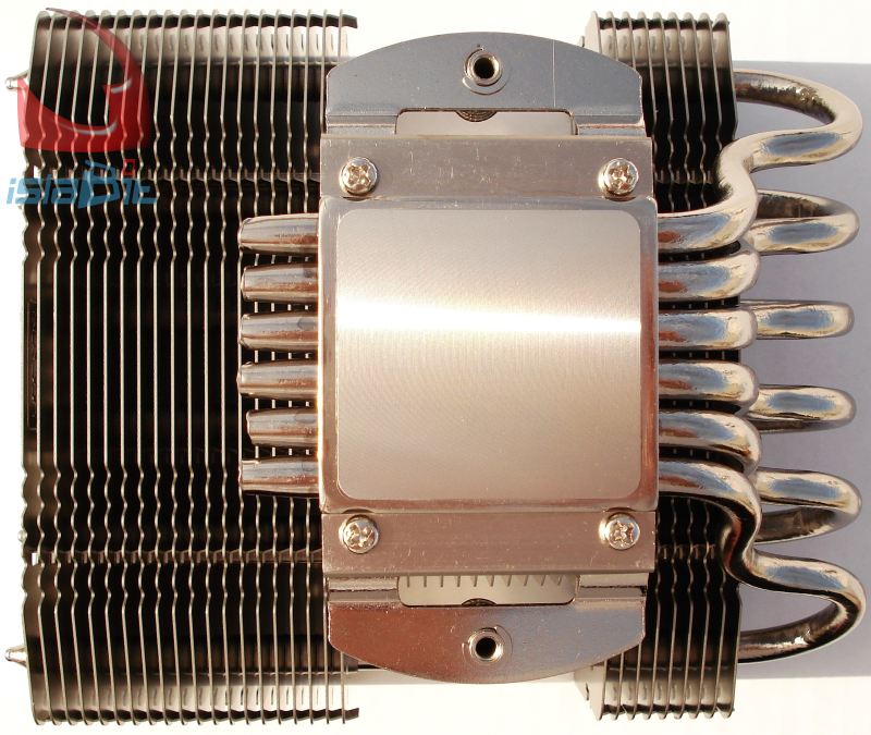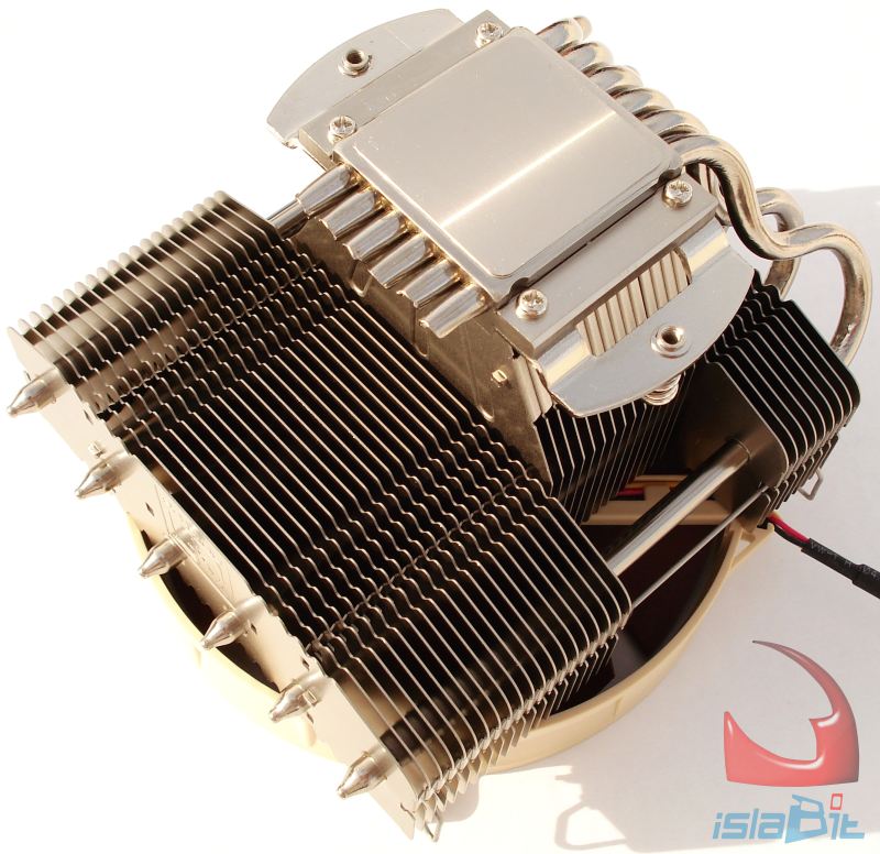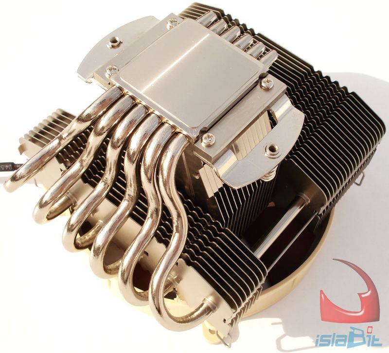 Centrándonos ya en su base y en su construcción, vemos que ésta difiere ligeramente con la base del los disipadores de NOCTUA que montan los ventiladores perpendiculares a la base. En esta ocasión Tenemos dos partes, que atrapan los tubos, pero la parte superior no está libre, sino que en ella directamente se monta el cuerpo que sostiene a todo el disipador por su parte central, a través de 15 aletas que crecen hasta la parte superior del disipador. Los 2 tubos laterales son los que menos trabajo realizan de los 6, por no estar cubiertos por completo por todas las aletas.