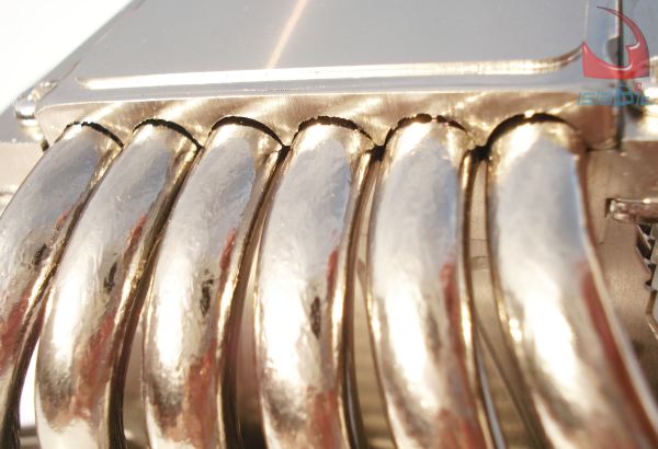 Aquí se ve perfectamente a qué nos referíamos antes con el acabado de las puntas inferiores, donde nacen. Esta vez, por esta cara si se cubre de forma adecuada todos los tubos. En parte los tubos sobresalen un poco en exceso por su doblado en punta. Esto impide que los tubos se oxiden por su interior, ya que como es lógico no están bañados con niquel-plata.