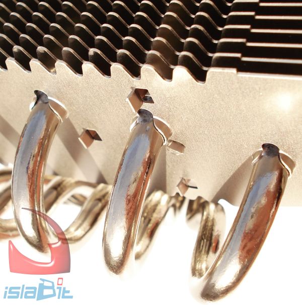 Las «montañas rusas» de los heatpipes. Con ellas y con elevar y cortar las aletas de esta forma, se permite conseguir los huecos inferiores. Vamos a detallar más los tubos y las aletas abandonando ya la base…