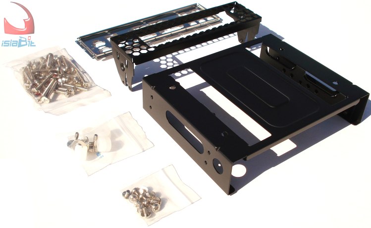 Tenemos un total de 5 piezas, a parte de la plaquita trasera para la placa base. El pack está compuesto por 3 bolas de cierre hermético con varios kits de tornillos para poder montar desde los discos duros hasta las lectoras y otras unidades. Una de las bolsas contiene un kit con antivibradores para una unidad de disco duro. Con las otras 2 piezas, tenemos un carril para disquetera que junto a una placa frontal reduce el tamaño de uno de los huecos frontales de la caja de 5.25″ a 3½, así podemos montar una de estas unidades o simplemente montar ahí un disco duro escondido conservando el frontal de 5.25″. Lo cierto es que cada vez hay menos motivos para implementar tantos huecos de 3½, aún así un par de kits de estos, con el carril y el frontal, no vendrían mal, pero el producto solo nos trae uno.