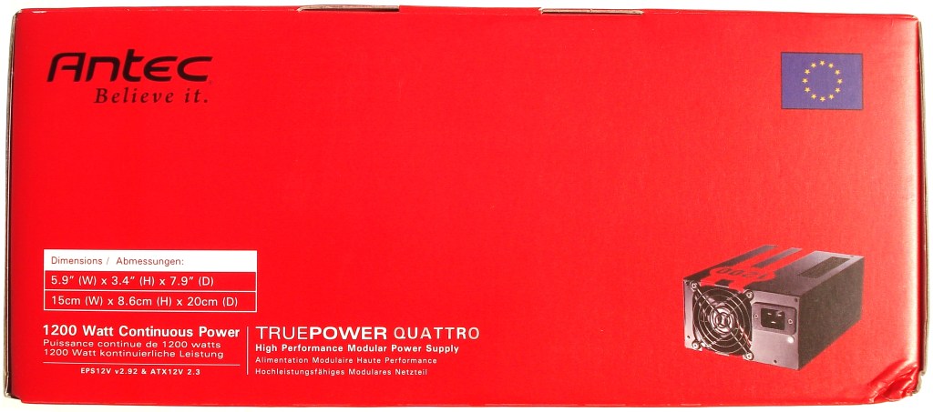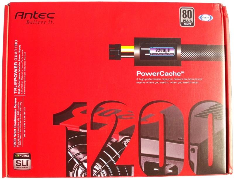 - En texto vertical en la izquierda, vemos el modelo perteneciente a la serie TRUEPOWER QUATTRO y la cantidad de potencia continua de 1200W.