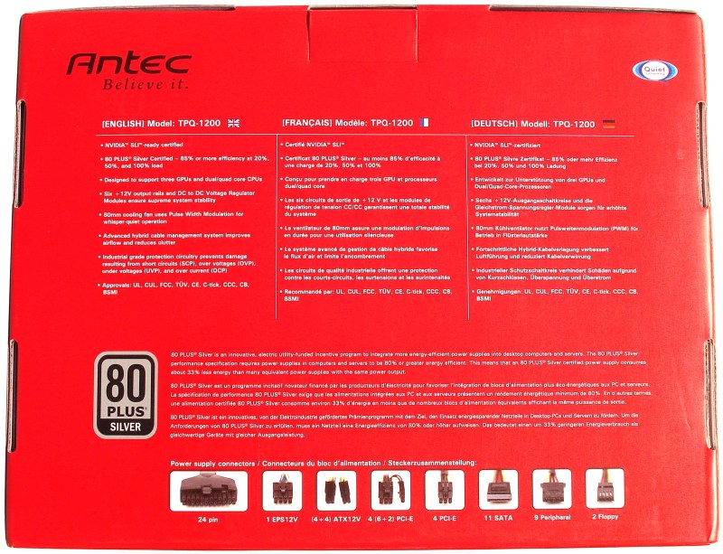 En esta cara ya se añaden las características más destacables descritas en Inglés, Francés y Alemán. Aumenta de importancia el hecho de poseer el certificado 80PLUS SILVER, describiendo una breve explicación al respecto. A bajo del todo vemos la compatibilidad de conectores, con los distintitos dispositivos de conexión.