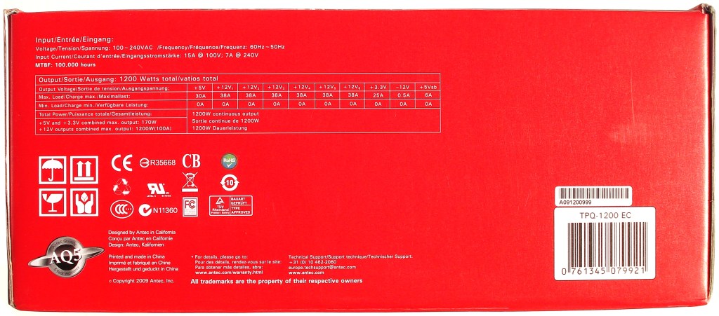 Aquí ya vemos las especificaciones técnicas de las salidas de la fuente. Más abajo vemos diferentes certificados y logos de cumplimiento; marcado CE, RoHS, etc. Así como que es poseedora de una excelente garantía de 5 años, con el cuño «AQ5» de ANTEC. A la derecha vemos el modelo y código de barras del propio producto.