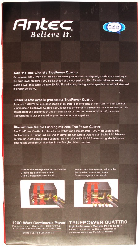 De nuevo, en tres idiomas, nos describe brevemente el producto en este lateral. Destaca 2 viñetas con la configuración con y sin cables, haciendo uso del concepto que ANTEC le ha dado de «Hybrid Cable», que no es más que la característica modular de los cables, de la fuente (una serie de cables que se puede conectar y desconectar del panel delantero de la misma fuente).