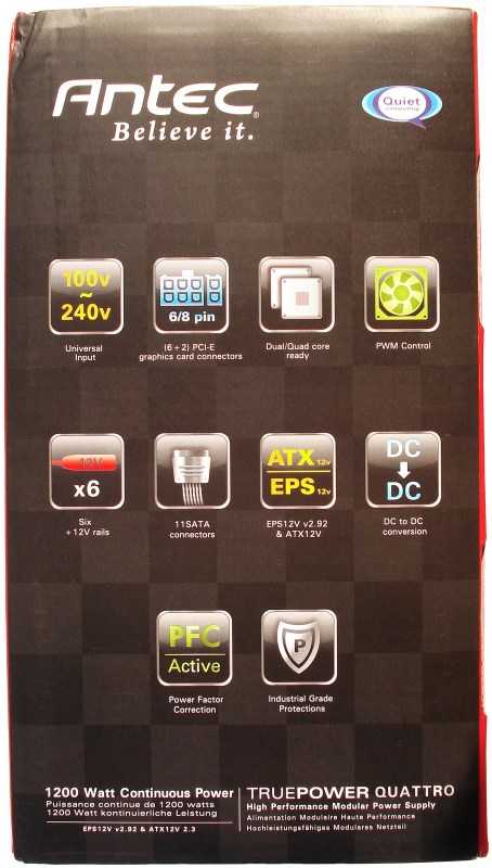 Y este lateral es el más vistoso de todos. A modo de escudos, ANTEC nos muestra algunas de sus características, donde prácticamente todas son destacables. Las más importantes son sus 6 railes de +12V, PFC Active, DC to DC conversion, etc.
