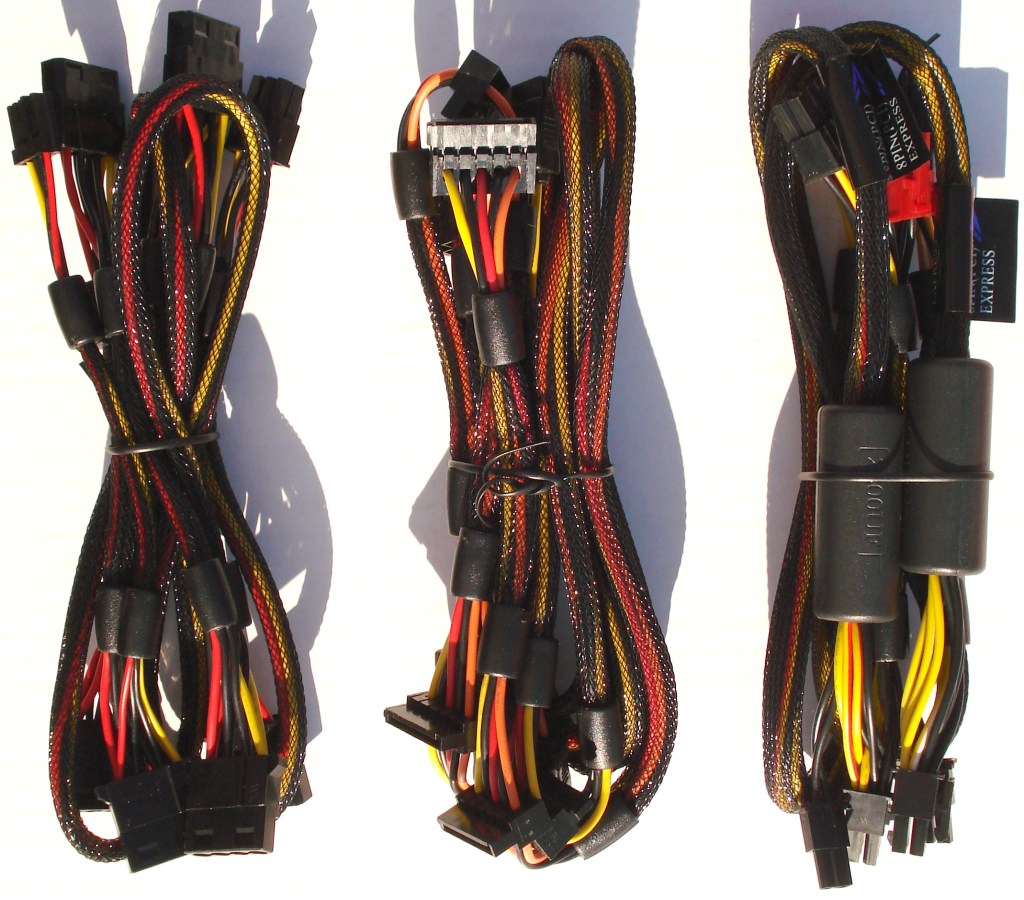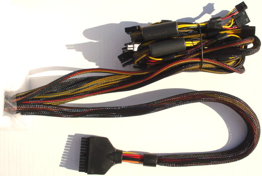 Estos son los cables soldados a la fuente. Entre ellos, como no, el principal de 24 pines para conectar directamente a la placa base. Todos los cables, como luego veremos, son de longitud considerable y enfundados en su totalidad hasta los extremos, con malla negra ignífuga de calidad.