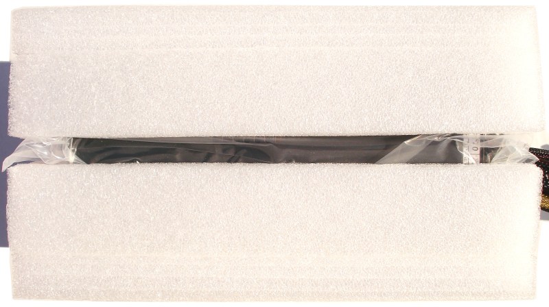 Si cogemos la fuente sin desproteger, tenemos dos esponjas duras que rodean todo el prisma a modo de sándwich, la configuración de protección más usada para este tipo de productos. Si nos fijamos bien, estás protecciones casi cubren con totalidad toda la fuente; se nota que ANTEC ha querido protegerla perfectamente.
