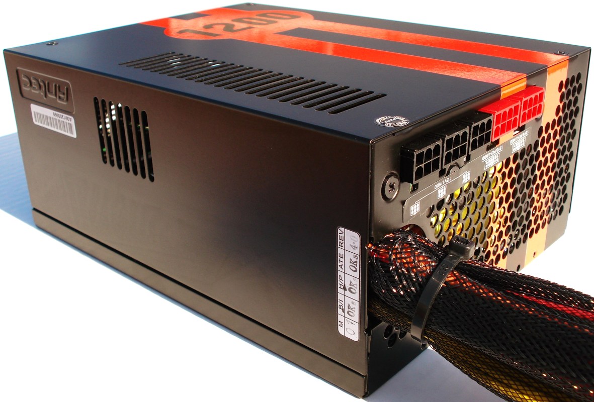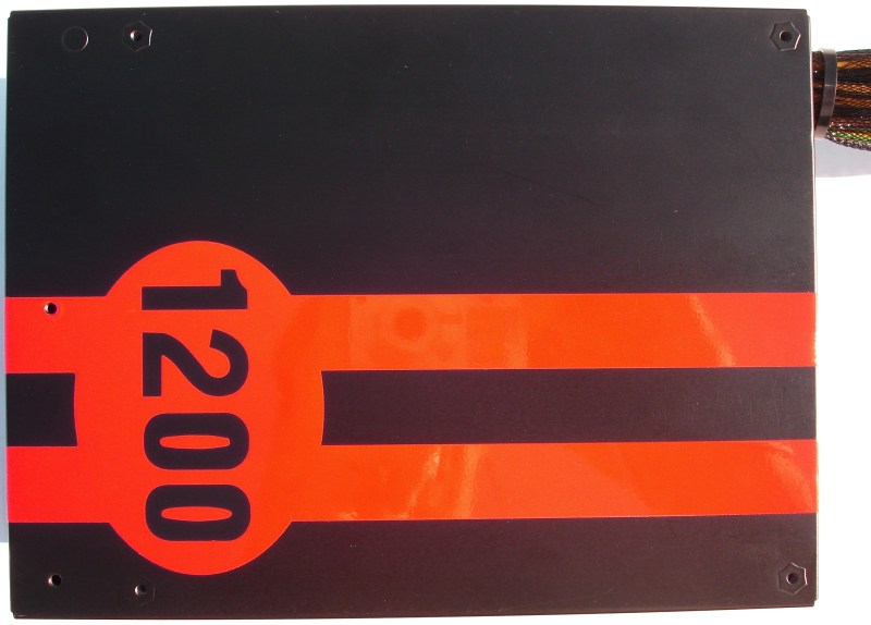 Esta es la cara inferior, totalmente plana y opaca, sin ninguna obertura. En ella está atornillada la placa de electrónica de su interior. Aquí se luce maravillosamente el motivo de competición que ANTEC ha querido dotarle. El número 1200 es el motivo principal, llamativo por su elevada cifra, indicando que es una fuente muy potente, de 1200W.