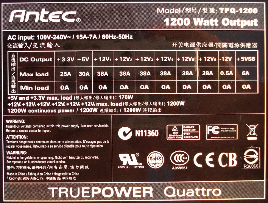 Como comentamos en un principio, lo más destacable es su número de raíles de +12v. Hasta 6 raíles con 38A. Los otros dos raíles, también disponen de una intensidad considerable, de 25A para la tensión de +3.5V y de 30A para la tensión de +5V. Éstos dos últimos nos ofrecen una potencia de carga de 170W. Los otros 6 raíles nos pueden ofrecer una carga de 1200W. La carga continua se sitúa en los 1200W.