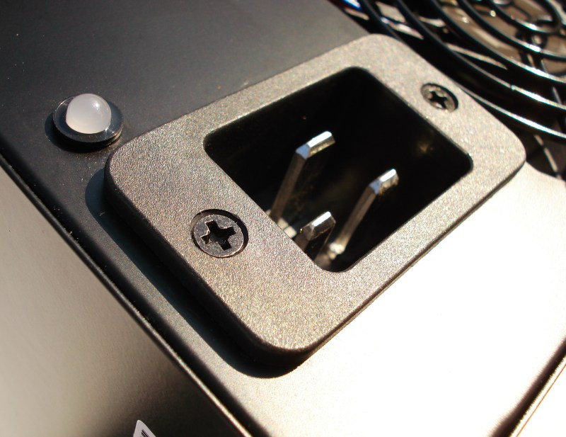 Acostumbrados a una toma hembra determinada para el cable de alimentación de 230V, es cierto que este dispositivo soportará los 1200W, por tanto este cable y sus conexiones tienen que cumplir unos requisitos de seguridad extras. Y así se ve con esta conexión. El conector es de calidad, imposible de desprender del chasis metálico ni haciendo palanca. Un punto más a favor respecto de la seguridad. Quizá se podría mejorar este tipo de conector, ya que a veces es fácil de desconectar. Tal vez, la seguridad esté a favor de que así sea. Y hasta el led instalado permanece firme aunque lo presionemos.