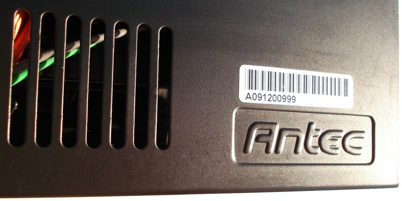 La fuente dispone de tres rejillas en el propia chapa. Esta es la correspondiente al lateral. Con ella se permite que el ventilador haga circular el aire «tragándolo» por estas rejillas. En la derecha vemos el código de barras de la propia fuente, y a bajo, prensado el nombre de ANTEC, bonita forma de marcarse.
