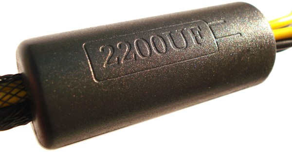 Estos capacitadores funcionan con corriente continua, ya que la propia fuente se ha encargado de convertirla de la corriente alterna. Un capacitador funciona como una «pequeña batería». Es una pieza con 2 bornes (dos extremos de conexión) polarizados y un semiconductor, líquido iónico o sólido (cerámico u otros materiales sólidos) que actúa como pequeño almacén de energía. La propia fuente de alimentación posee varios de estos dispositivos eléctricos, que actúan como almacén de carga y regulación de la tensión (voltaje) de salida. En este caso, los condensadores (capacitadores electrolíticos) son de 2200uf (micro-faradios) y almacenan parte de la energía inicial que les llega de la propia fuente y luego descargan continuamente dicha energía, de manera armónica. Dicho de otro modo, este capacitador electrolítico siempre está cargado con esa pequeña cantidad de energía mientras el cable está en carga, suministrando la tensión de 12V, de manera que a una pequeña demanda extra de potencia, es el propio capacitador quien la ofrece, regulando el flujo de energía (semejante al funcionamiento interno de la propia fuente, solo que esta vez, se ha separado independientemente por cada cable), haciendo finalmente más estable el propio cable.