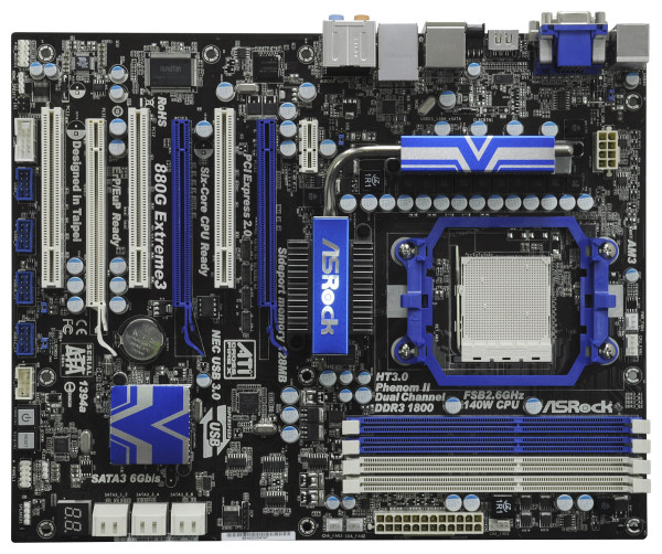 La placa, llamada ASRock 880G Extreme3, tiene una PCB de color negro en contraste con los colores blanco y azul de las conexiones, y posee un diseño de energía de 8+2 fases, soporta procesadores AM3, y trae tres ranuras PCI Express x16 para configuraciones Hybrid CrossFireX y CrossFire, además integra gráficos ATI Radeon HD 4250, y cuatro ranuras de memoria DDR3 1800MHz.
