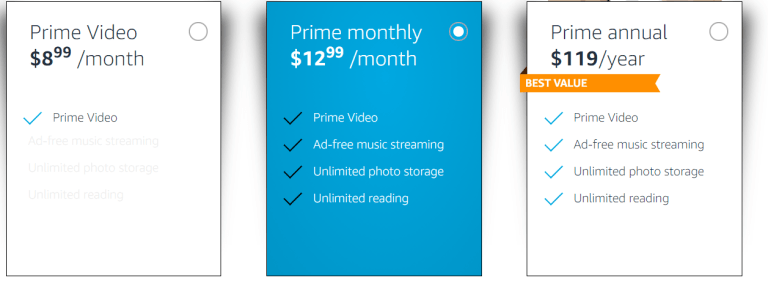 Aquí tenemos opciones un poco más amigables en términos generales. Podremos adquirir únicamente Prime Video por un costo mensual de $ 8.99. También podemos obtener Amazon Prime Video por $ 12.99 que incluye la posibilidad de acceder no únicamente a Prime Video, también al servicio de streaming, almacenamiento de fotos ilimitado, etc. Y tenemos otra opción que es el plan anual por $ 119 que tiene acceso a todo y es más económico.