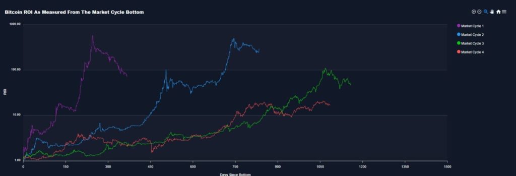 El análisis histórico indica que cada siclo sucesivo de BTC ha sido más largo que el anterior, además está disminuyendo lentamente la importancia del halving cada cuatro años. Al mismo tiempo, también está disminuyendo el ROI (retorno sobre la inversión) en los ciclos sucesivos, por lo que los hodlers obtendrán rendimientos más bajos con el paso del tiempo.