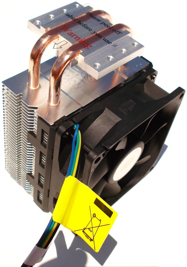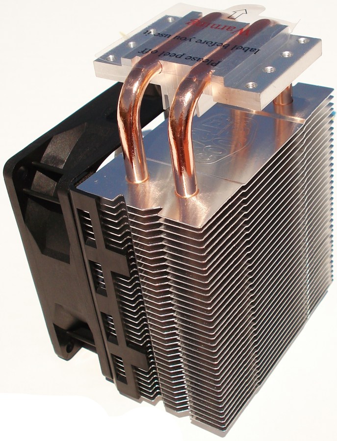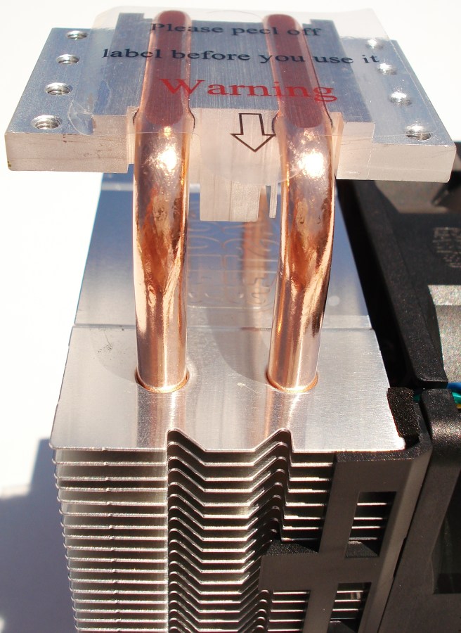 El sistema de refrigeración es muy sencillo. Se divide en 2 partes, el propio disipador con su base y 2 heatpipes de cobre en forma de U, que asoman por debajo de ésta y sirven como soporte para las aletas de aluminio. Por otro lado tenemos el propio ventilador de 8x8cm.