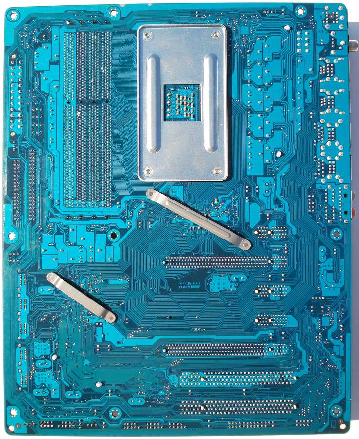 La parte trasera está excelentemente reforzada. Esperamos ver esta estampa muy a menudo. La parte trasera del North Bridge 790FX y del South Bridge SB750 están reforzadas con dos chapas alargadas metálicas y atornilladas, en lugar de utilizar los plásticos de enganche. Esto mejora notablemente su durabilidad. Y es que los usuarios tenemos la gran manía de coger la placa base en el disipador del North Bridge, cosa para nada aconsejable. La parte trasera del socket AM3 viene reforzada con una chapa metálica y atornillada. Excelente en este apartado.