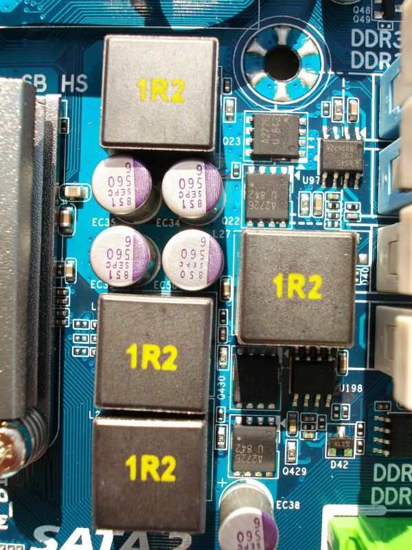 Estas piezas están repartidas por toda la placa base, y junto con la tecnología 2OZ PCB de cobre GIGABYTE consigue disminuir la resistencia al paso de la electricidad en toda la electrónica de la placa base hasta un 50% respecto de los diseños convencionales. Esto, como ya sabemos genera menos perdidas eléctricas, menos calor, por tanto mayor eficiencia energética y en general menor consumo.