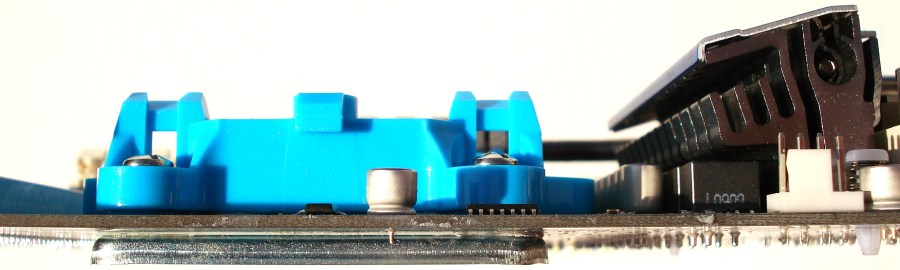 El perfil de la placa base es bastante esbelto. Lo que más abulta, como no, es la refrigeración pasiva, suficientemente apartada para no tener problemas de montaje. Al mismo tiempo los condensadores de la zona son de perfil bajo, para evitar chocar contra un sistema de refrigeración que requiera desmontar el plástico azul del socket AM3. Todo parece estar bien pensado.