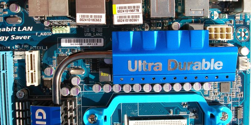 Para darle un toque más moderno, potente y llamativo, GIGABYTE opta por forrar superficialmente con una chapa de aluminio el disipador con color azul, distintivo de la marca, con las palabras Ultra Durable.