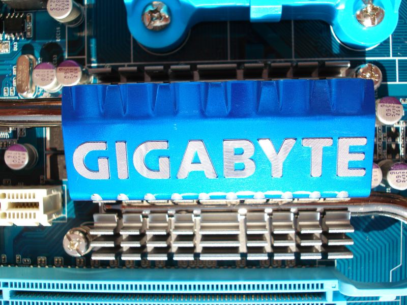 Algo parecido ocurre en el chip de AMD 790FX del North Bridge. Disipador, heatpiepe, y chapa superficial, esta vez con el nombre GIGABYTE.