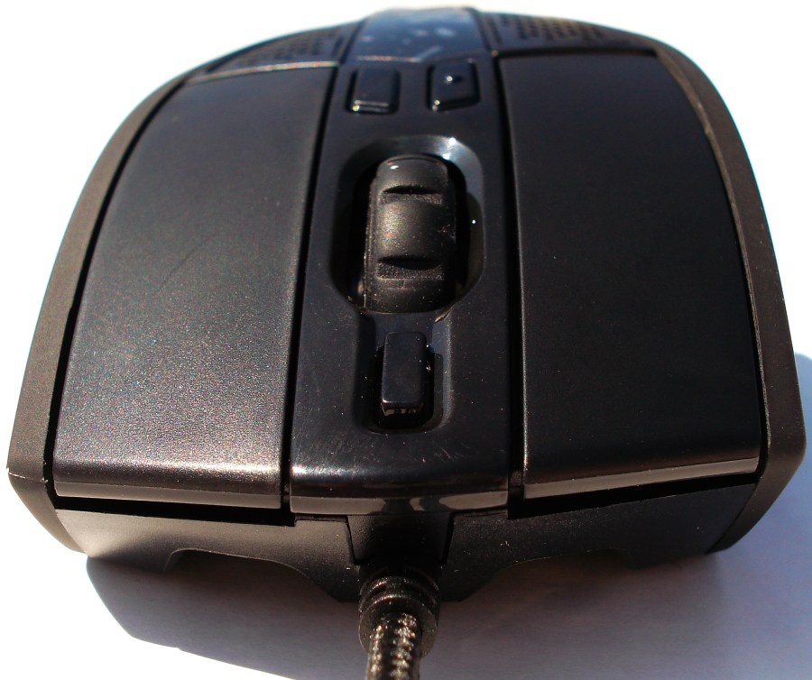 Esta es la zona gobernada por los dedos índice y corazón (dos de los tres más largos de la mano). Ambos dedos descansan con totalidad sobre los dos botones principales del ratón, sobrando parte del a superficie por las puntas. Así nuestras yemas siempre estarán cómodas. El tacto de ambos botones es agradable y los interruptores hacen un «clic» de calidad. A veces estos mecanismos se estropean de tanto pulsarlos, y hay que fabricarlos a la perfección ya que son los más castigados. Desgraciadamente tendríamos que usar el ratón más tiempo, y solo hemos tenido la ocasión de probarlos durante algunas semanas.