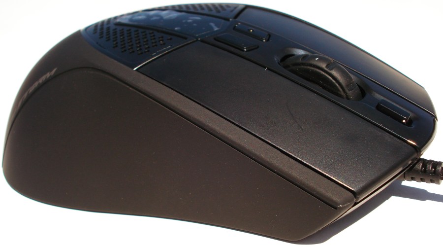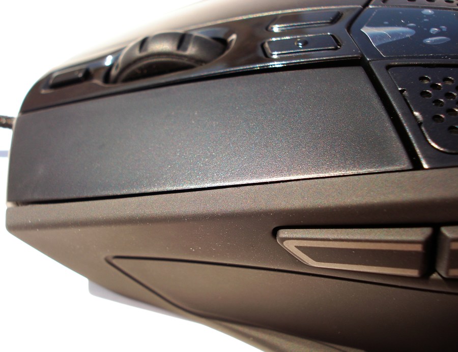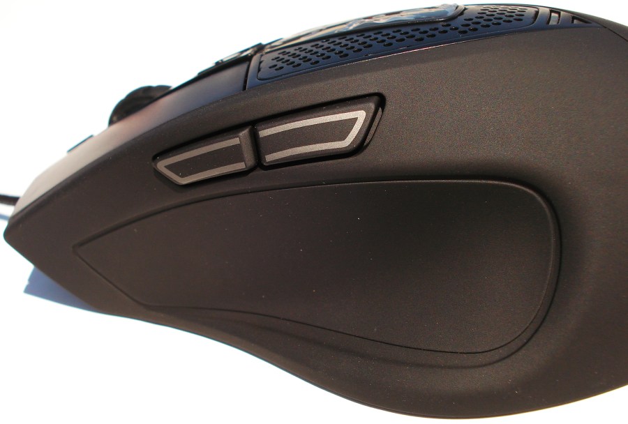 Los dos botones laterales izquierdos son configurables y con un tacto notable. Son botones de calidad y eso se nota. Están hechos con una silueta identificable por sus trazos y por su puesto por su posición. De manera que sin mirar el ratón es fácil localizarlos con el dedo pulgar. Están suficientemente altos para que no molesten al pulgar mientras éste esté descansando sobre el lateral izquierdo.
