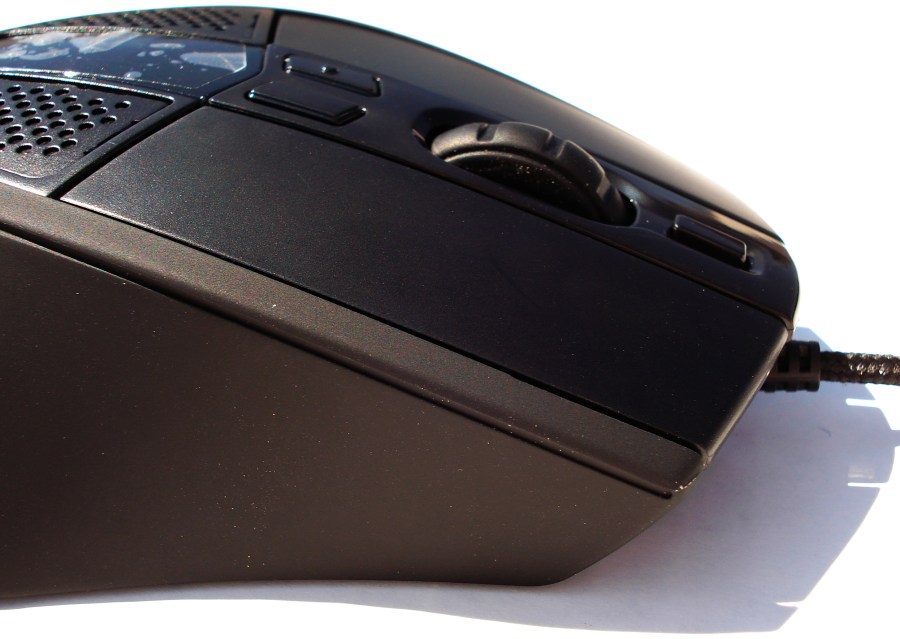 Aquí lo vemos con más detalle. Los dedos índice y corazón rozan por los laterales de la rueda si nos movemos bruscamente en ocasiones. Recordamos que este es un ratón gamer, y como tal a veces provocamos movimientos fuera de lo común al jugar.