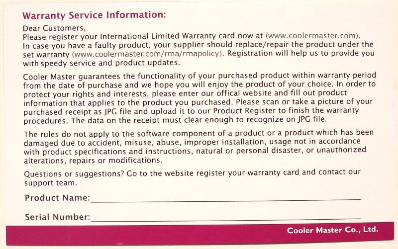 Con esta tarjeta COOLER MASTER nos invita a que registremos la compra del producto para disfrutar de una garantía completa del mismo. Está únicamente descrito en inglés.