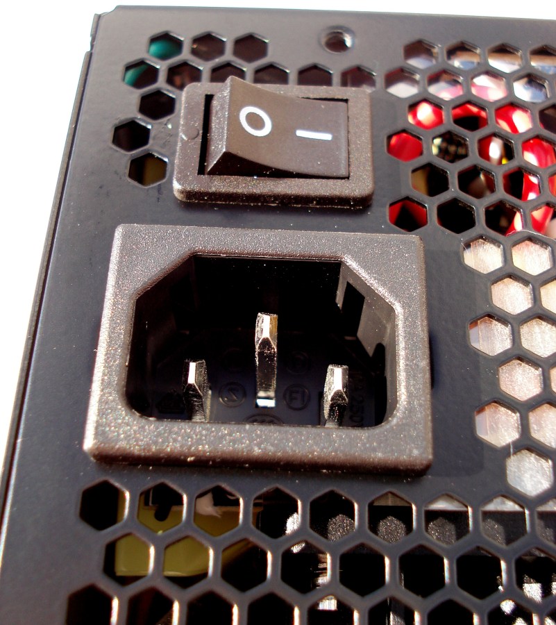 Tanto el conector como el interruptor son las únicas piezas que sobresalen de todas las caras de la fuente (a parte claro está, del cableado de la fuente). Hemos forzado el interruptor y funciona correctamente y es suficientemente resistente y encaja bien en ambas posiciones, de encendido y apagado. Del conector de alimentación hemos intentado tirar fuertemente de el y ha resultado imposible moverlo. Esta pieza debe estar exageradamente fijada a la placa metálica de la fuente por medidas de seguridad. Y así es…