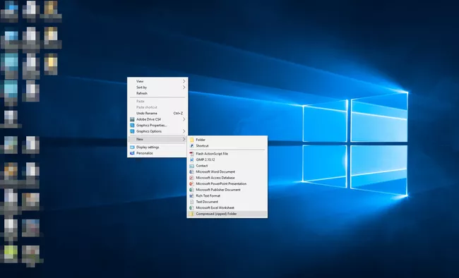En nuestro escritorio, daremos clic con el botón derecho del ratón en un espacio en blanco y en este menú vamos a elegir Nuevo > Carpeta comprimida (en zip).