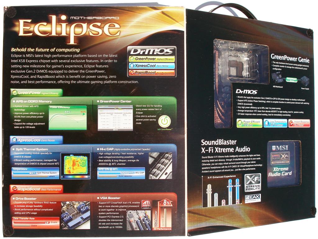 La presentación externa de la caja es muy llamativa. Colores, de fuego, dan radicalidad al producto. La caja se abre a modo de libro para mostrarnos todas sus características principales. Destacamos su tecnología DrMOS (GreenPower, XpressCool, RapidBoost), sus tarjeta de sonido con chip X-Fi Extreme Audio con tecnología directa de Sound Blaster, y su compatibilidad con los procesadores más potentes del mercado, los i7 de Intel, gracias a su chipset X58 y socket 1366. Este producto está fabricado en China.