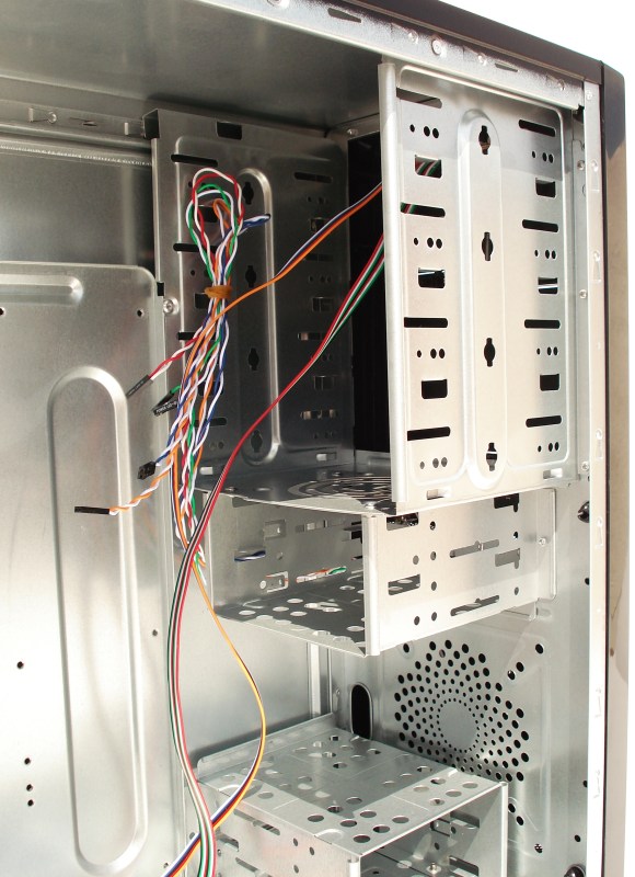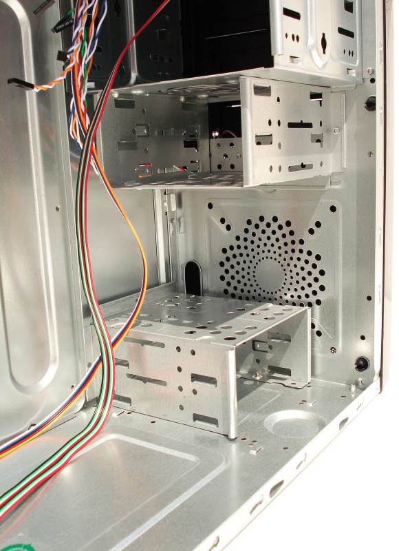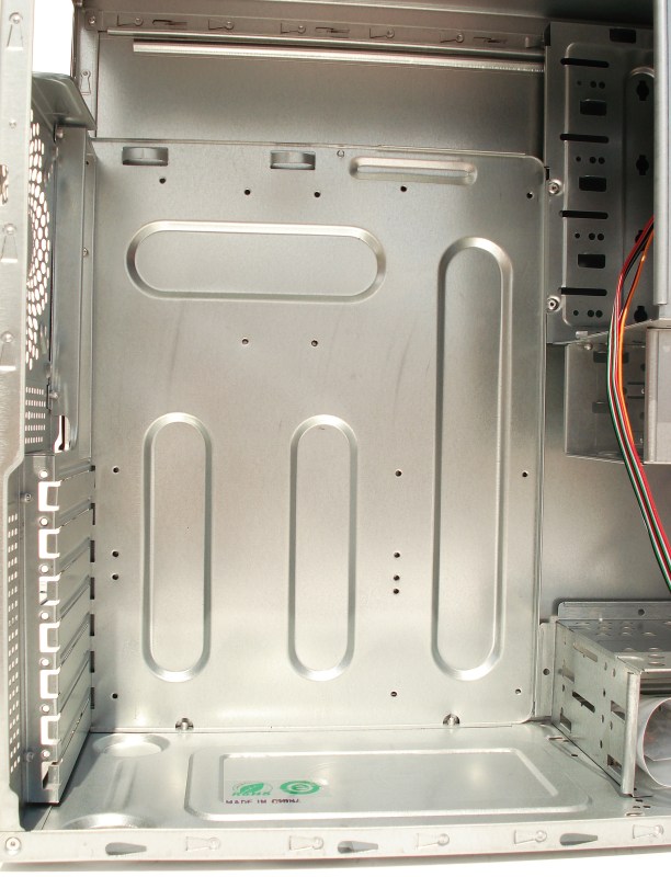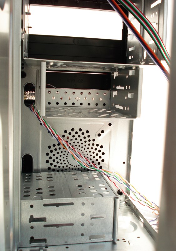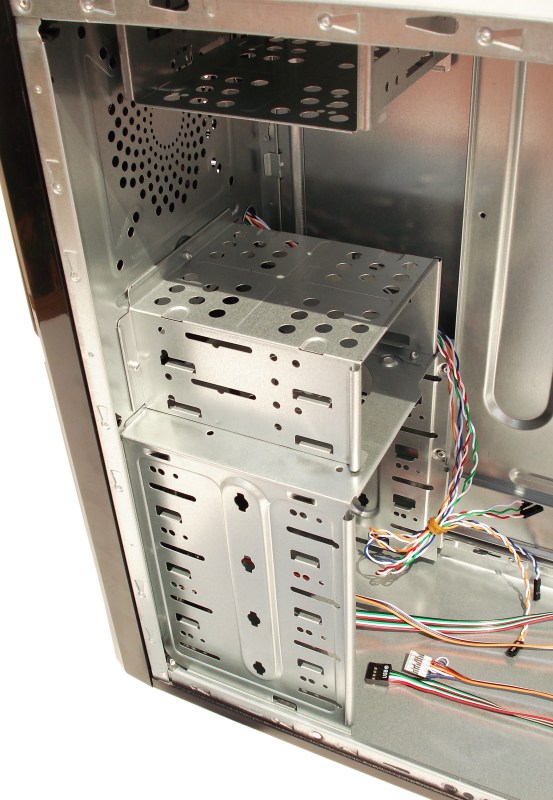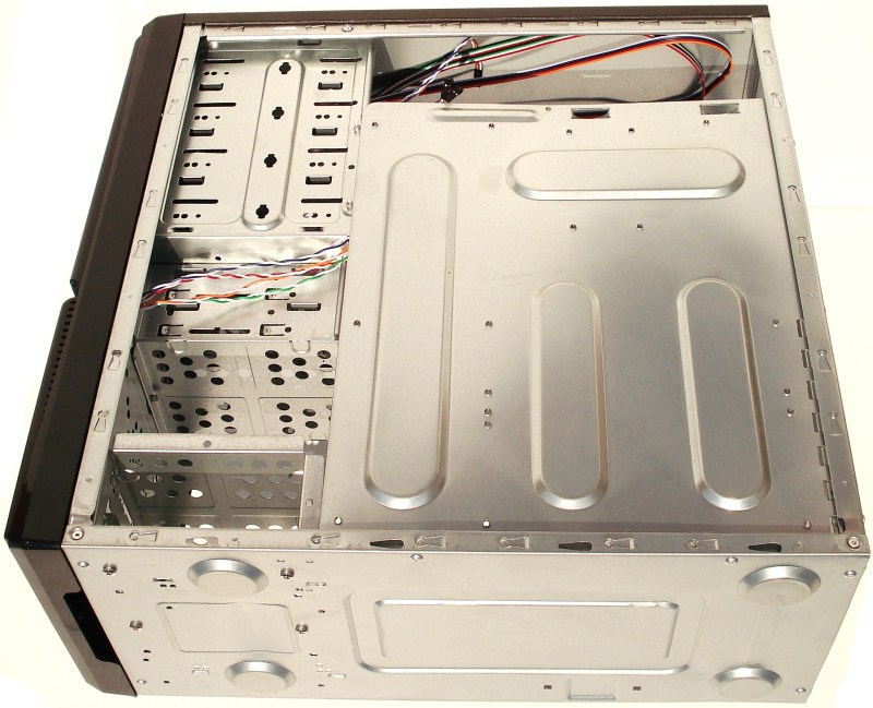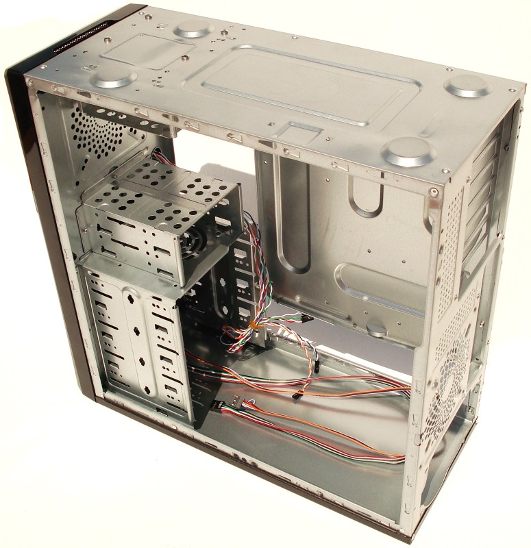 La división del interior está hecha en 5 partes principales. La zona de la fuente de alimentación (en la parte de arriba), la zona de la placa base (parte inferior), la zona de la unidades lectoras, más abajo la zona de las unidades más pequeñas para disco duro, separada en 2, una fija superior, y otra a modo de bandeja extraíble, en la parte inferior (fijada en el chasis por 4 tornillos).