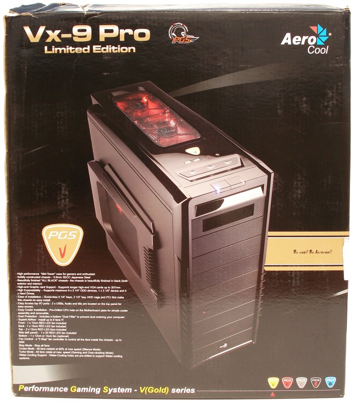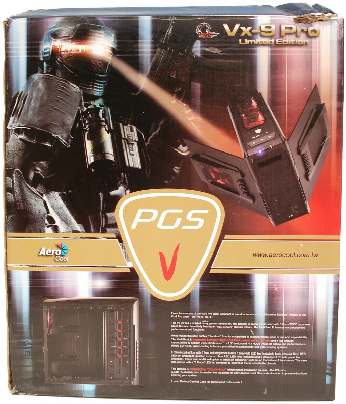 A la vista está la Serie PGS V a la que pertenece, así como un diseño arriesgado y agresivo toque moding que nos indica que estamos ante una caja destinada a los más jugones. De nuevo podemos ver más de sus características y un enlace a su pagina web principal www.aerocool.com.tw. El rojo parece destacar sobre el resto, por algo será…