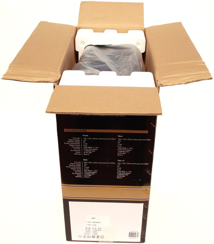 Empezando por el embalaje, podemos observar lo cuidado del tratamiento del cartón. Totalmente pintado de negro, lo hace más resistente si cabe a la humedad. El cartón es de doble capa de 0’5cm de grosor y se utiliza el grapado y la cinta adhesiva para su correcto cierre. Si os fijáis el cartón viene con un golpe rasgado en la parte superior. Como veréis más adelante, el producto de su interior ni se ha enterado. Así que la caja junto con las protecciones de polietileno de su interior hacen su función perfectamente, protegiéndolo ante los golpes. Así que AEROCOOL no escatima en gastos, a la hora de proteger y de presentar su producto.
