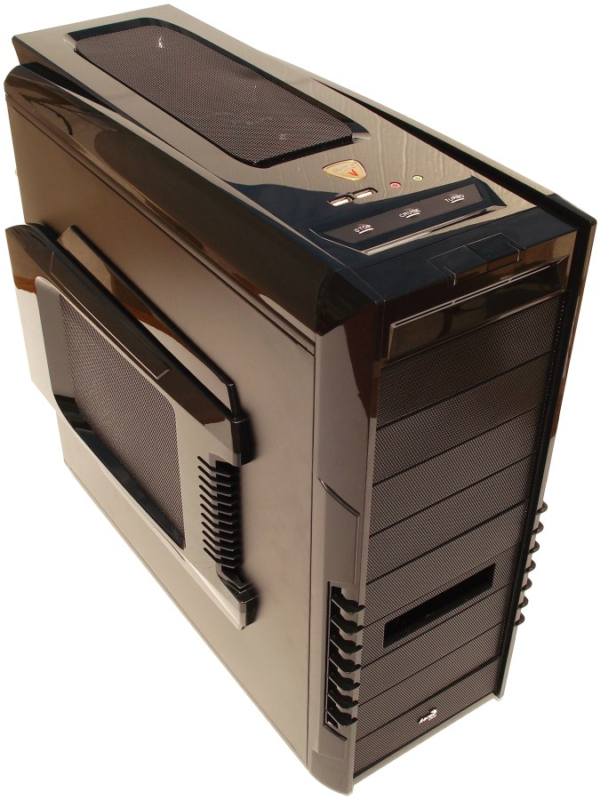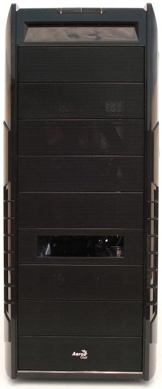Su frontal destaca por la sencillez de sus líneas. Es totalmente liso con un total de 9 alturas, cada una cubierta por una tapa. Tenemos hasta 7 tapas iguales y 2 distintas. Una para poder albergar un dispositivo de 3,5″, y la otra dispone de una plaquita de metal con la marca del fabricante AEROCOOL. Los saltos del frontal a los laterales empiezan a ser algo más de diseño, con un bonito muy acabado en plástico negro brillante. La «cabeza» del frontal remata el diseño de los laterales, donde se han colocado los dos botones de Reinicio y de Encendido/Apagado del sistema.