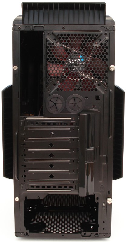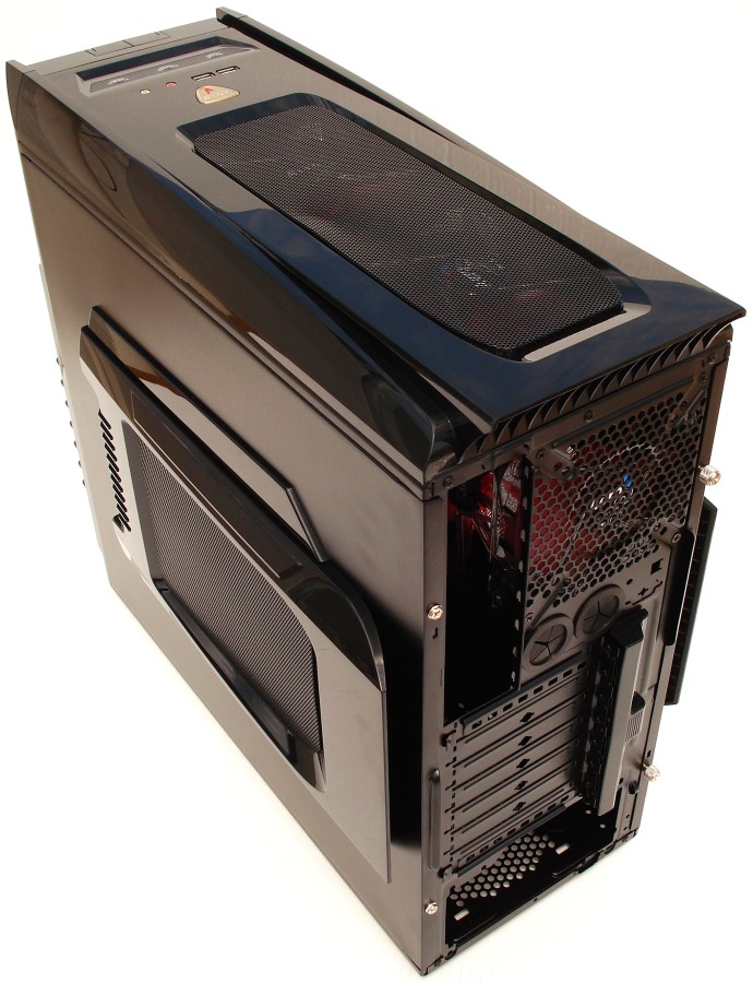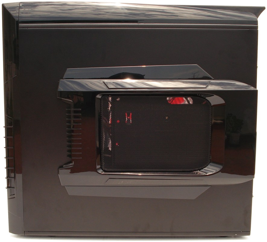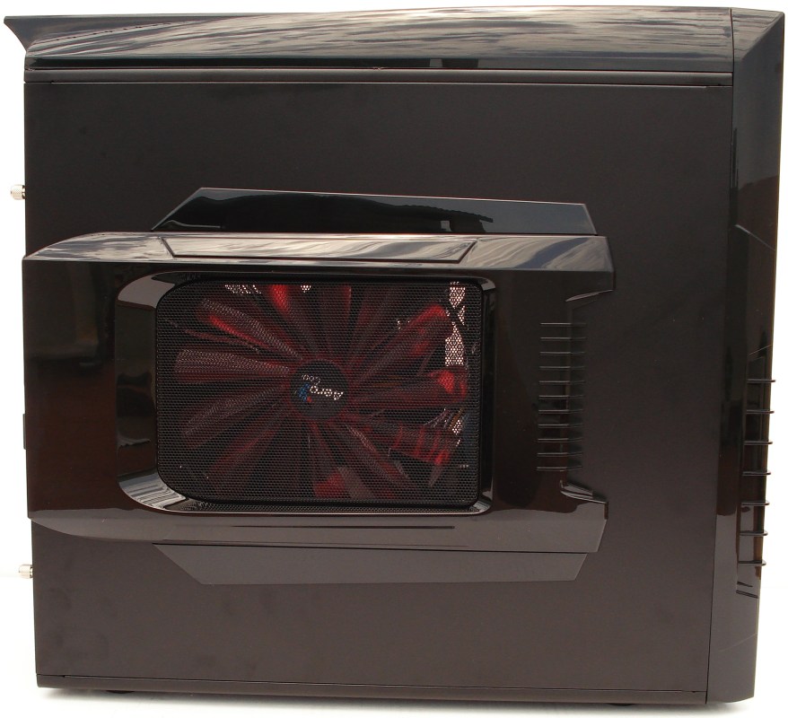 Seguimos con la agresividad en los dos laterales. Éste ya deja entrever un ventilador rojo, poderoso y relativamente silencioso de 20cm de diámetro. El diseño del saliente lateral es idéntico en ambos lados.