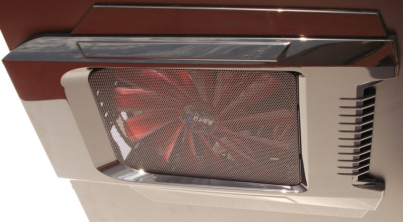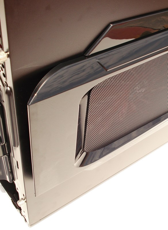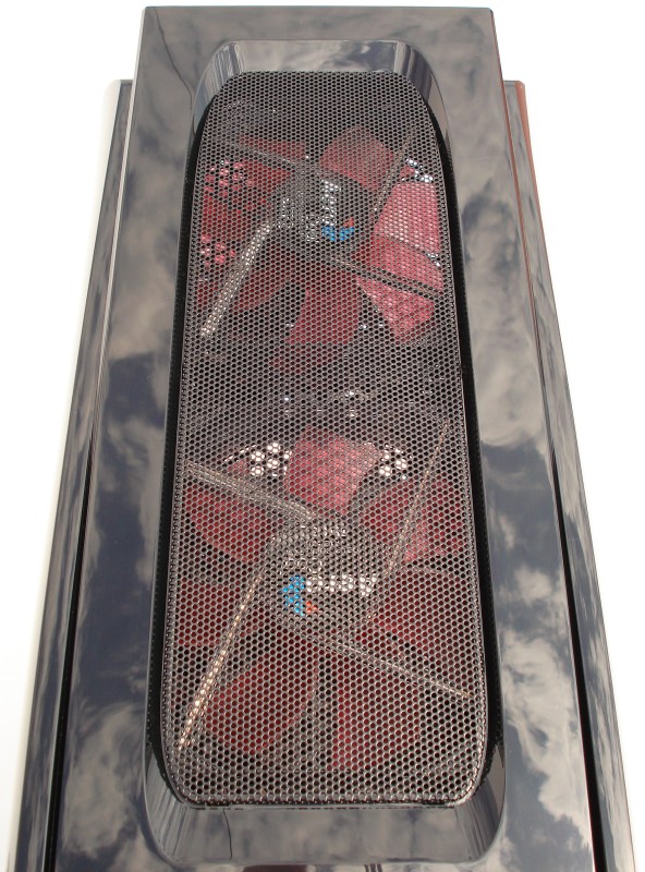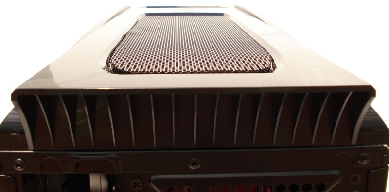 La forma de acabar el lomo de la Semi-Torre es sencilla y muy efectiva, aprovechando al máximo todo el espacio posible sin fastidiar la elegancia de la caja. Dos son los ventiladores instalados, que permiten extraer el aire hacia arriba a través de otra rejilla metálica sin filtro anti-polvo. Podéis observar como brilla el acabado del plástico reflejando el contorno.