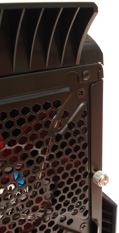 Esta terminación sobresale a modo de «peine», como un «tupé» sobre la cabeza de uno. En definitiva hace de voladizo en la estructura, y puede evitar que se nos acumule el polvo por detrás al decantarse por gravedad cuando el sistema esté apagado. Aún así dudamos que su funcionalidad sea esa, siendo más bien cuestión de diseño que de otra cosa. La terminación es robusta y a su vez, nos permite coger la Semi-Torre con seguridad por este extremo.