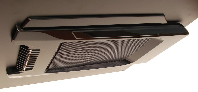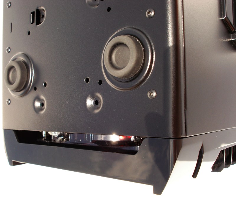 Tal y como hemos nombrado antes, quizá sea un inconveniente que la ventana lateral abulte tanto, y encima por ambos lados. A todo aquel que quiera empotrarse una caja de estas en su mueble deberá tener presentes estas dimensiones. El plano del saliente no es paralelo al plano de la cara del metal, sino que va curvo conforme recorremos hacia atrás. Aquí hay que mimar el producto, y esto es una buena forma de hacerlo. Una curva bien hecha siempre es más difícil de trazar que una recta.