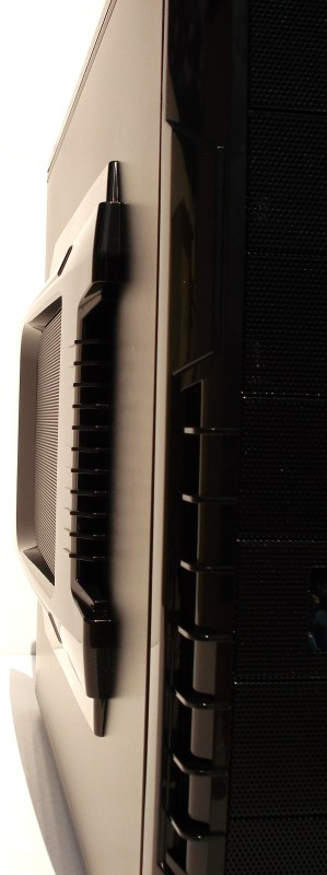 La ventana del lateral derecho es idéntica al izquierdo pero sin ventilación. Pero destacamos que posee una rejilla metálica perforada, evitando que se acumule el calor detrás de la Placa Base. Uno de los motivos por los cuales decimos que la caja está bien estudiada en el apartado de refrigeración por aire.