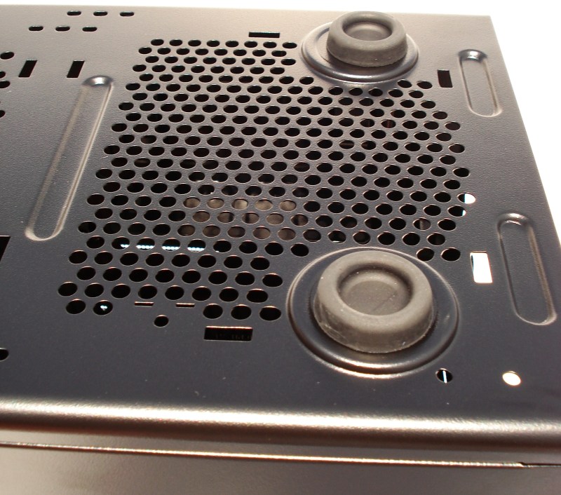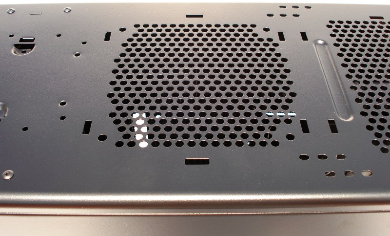 Esta es la ya vista área para succionar aire de la parte inferior, por parte de la futura fuente de alimentación (no incluida). Todas estas perforaciones son de aproximadamente 5mm de diámetro, por lo que se necesita de una rejilla anti-polvo para no succionar el polvo que pueda haber en el exterior y se acumule en nuestra fuente.