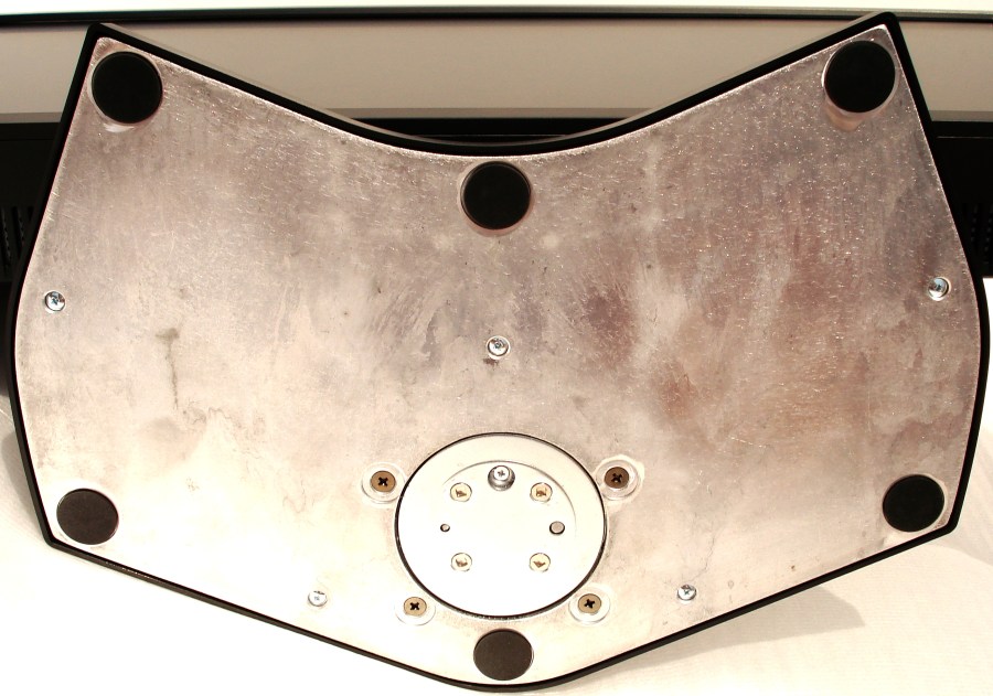 En la base se puede ver el sistema de rotación de 45º+45º que perminte girar el monitor, con ese dibujo circular con tornillería. Esta base tiene 6 patas de goma, 3 delante y 3 detrás que garantizan la fijación a la superficie.