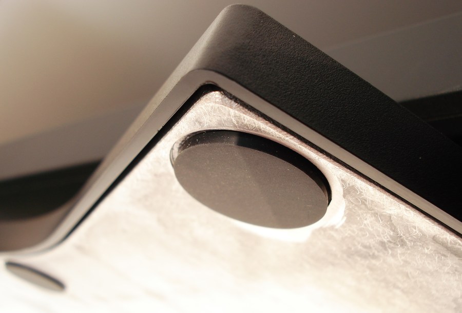 Cada pata de goma está fuertemente fijada al metal de la base. Cada pata está colocada en cada esquina, aprovechando así toda la superficie inferior de la base, consiguiendo la máxima área de apoyo posible, aumentando así la estabilidad del monitor.