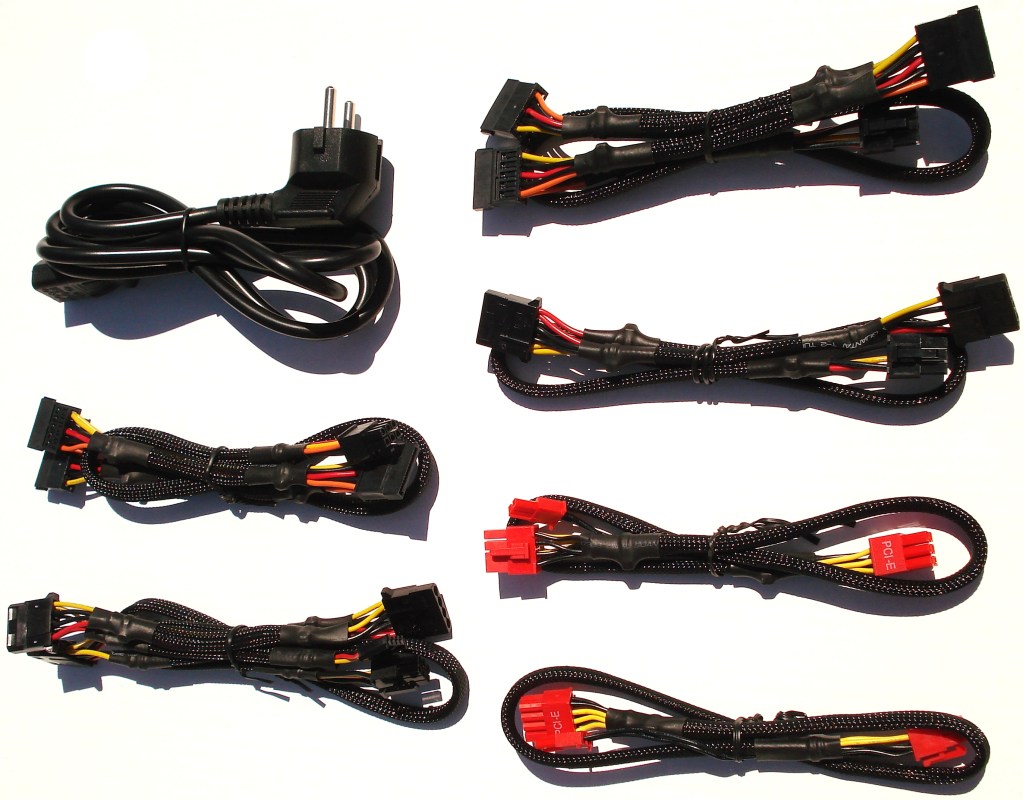 Para finalizara con este apartado, falta nombrar los cables modulares que acompañan a la fuente. Esta fuente es totalmente modular, y con ello se garantiza mayor orden y refrigeración en el interior de nuestra torre. Veámos qué cables son cada uno: